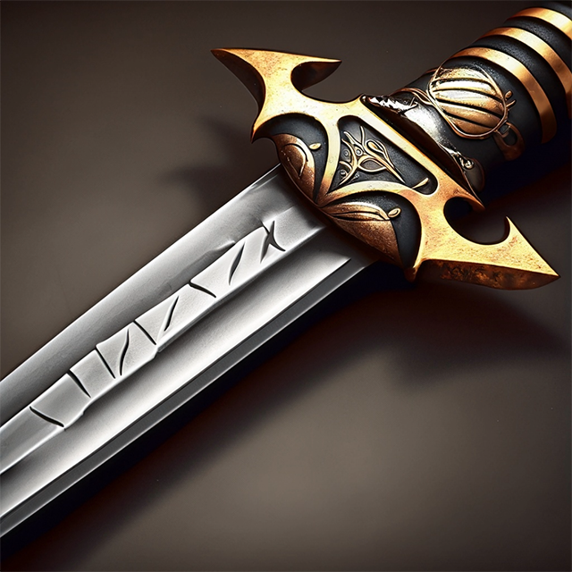 The sword is bright silver and bronze, with runic devices carved into the blade and The Yult Owl device carved into the crosspiece, the Yult Owl being sacred to Gloren. The sword retains the following positive properties: